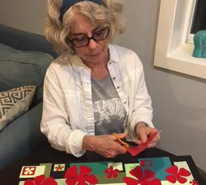 Janet begins by painting sheets of drawing paper with acrylic paint, focusing on creating different color palettes for each collage. As she starts cutting out shapes, or “drawing with scissors,” (without any pre-drawn sketches), different themes and designs evolve from her imagination where visual images she has experienced have left an impression in her mind.
